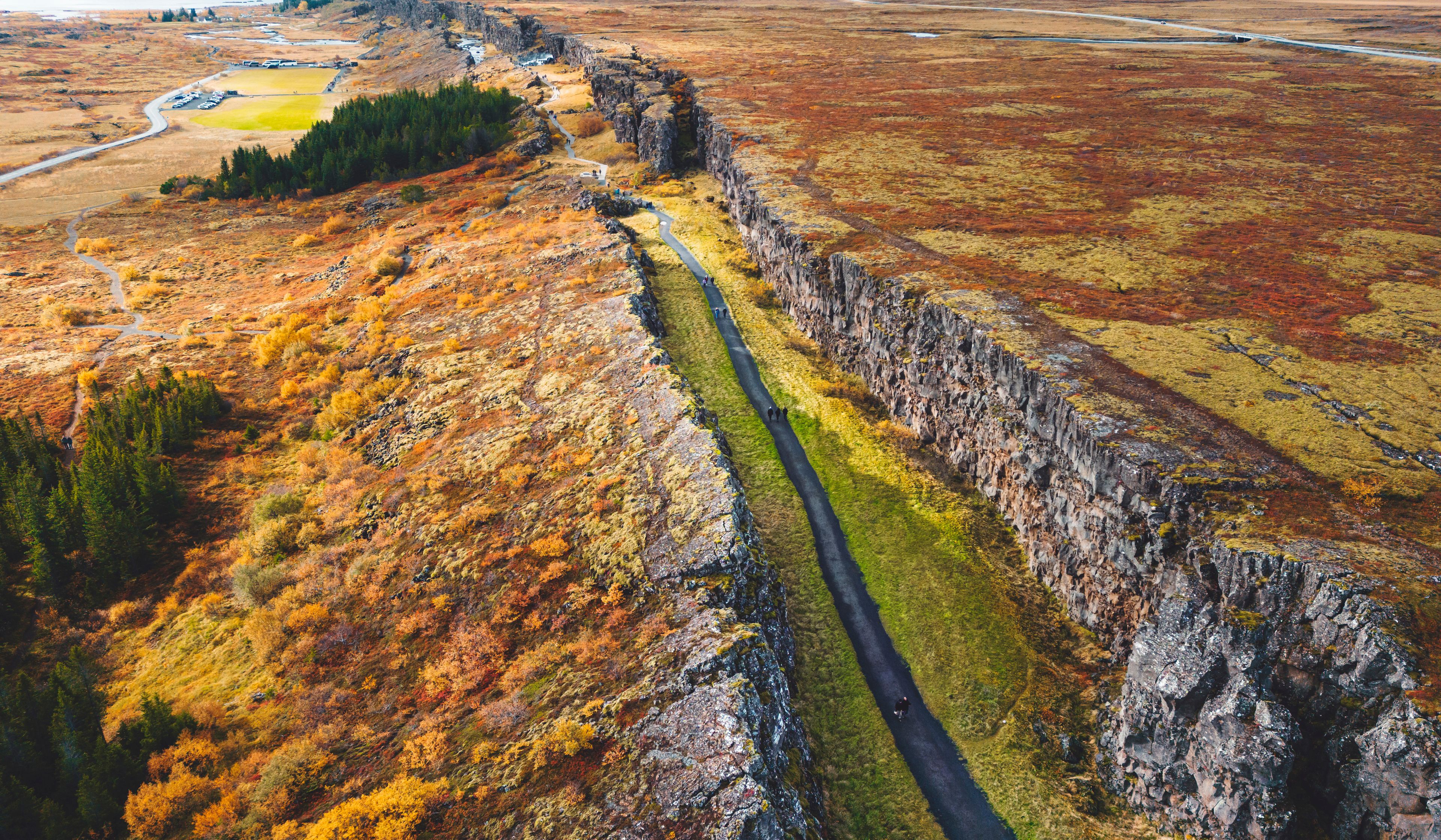 At Thingvellir National Park, you can actually see the gap between the North American and Eurasian plates. The Almannagjá Gorge is a striking example of how the separating plates have shaped the landscape, and you can even walk between two continents. The park also features the Silfra Fissure, a water-filled gap between the plates that’s popular for snorkeling and diving in its crystal-clear waters.