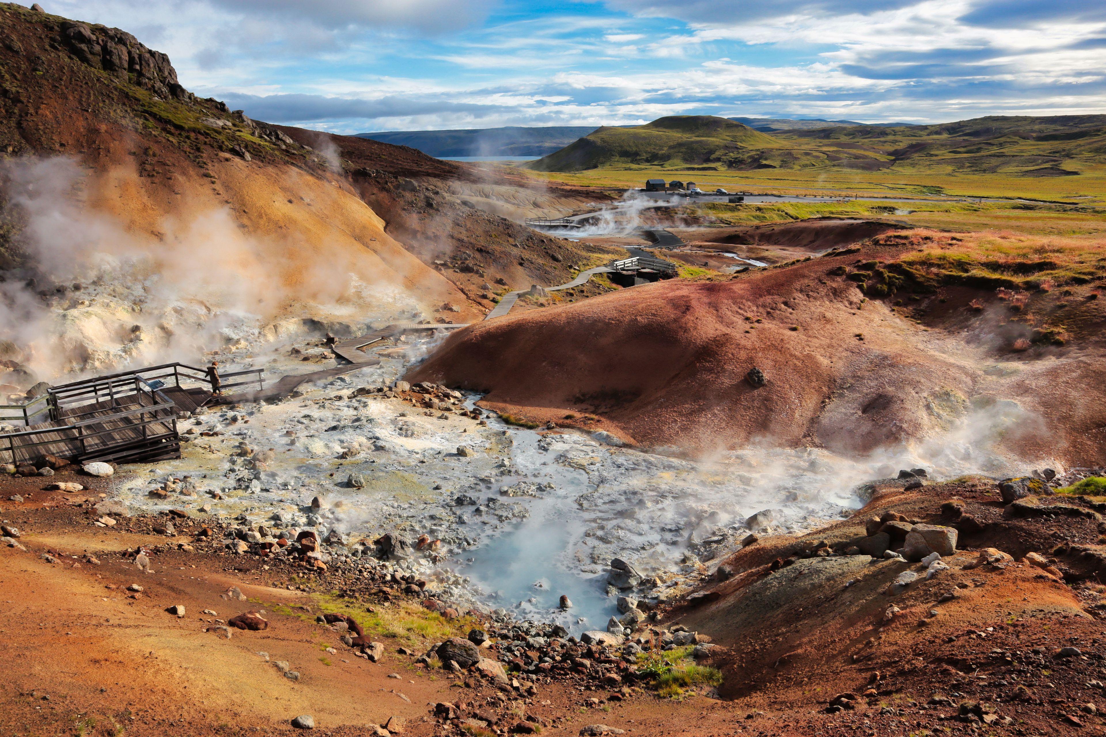 If you’re looking for a geothermal area that’s less crowded, Krýsuvík on the Reykjanes Peninsula is a great choice. It has steaming vents, bubbling mud, and colorful ground, just like Geysir, but without all the big crowds. Wooden paths take you close to the action, although you might notice the smell of sulfur in the air.