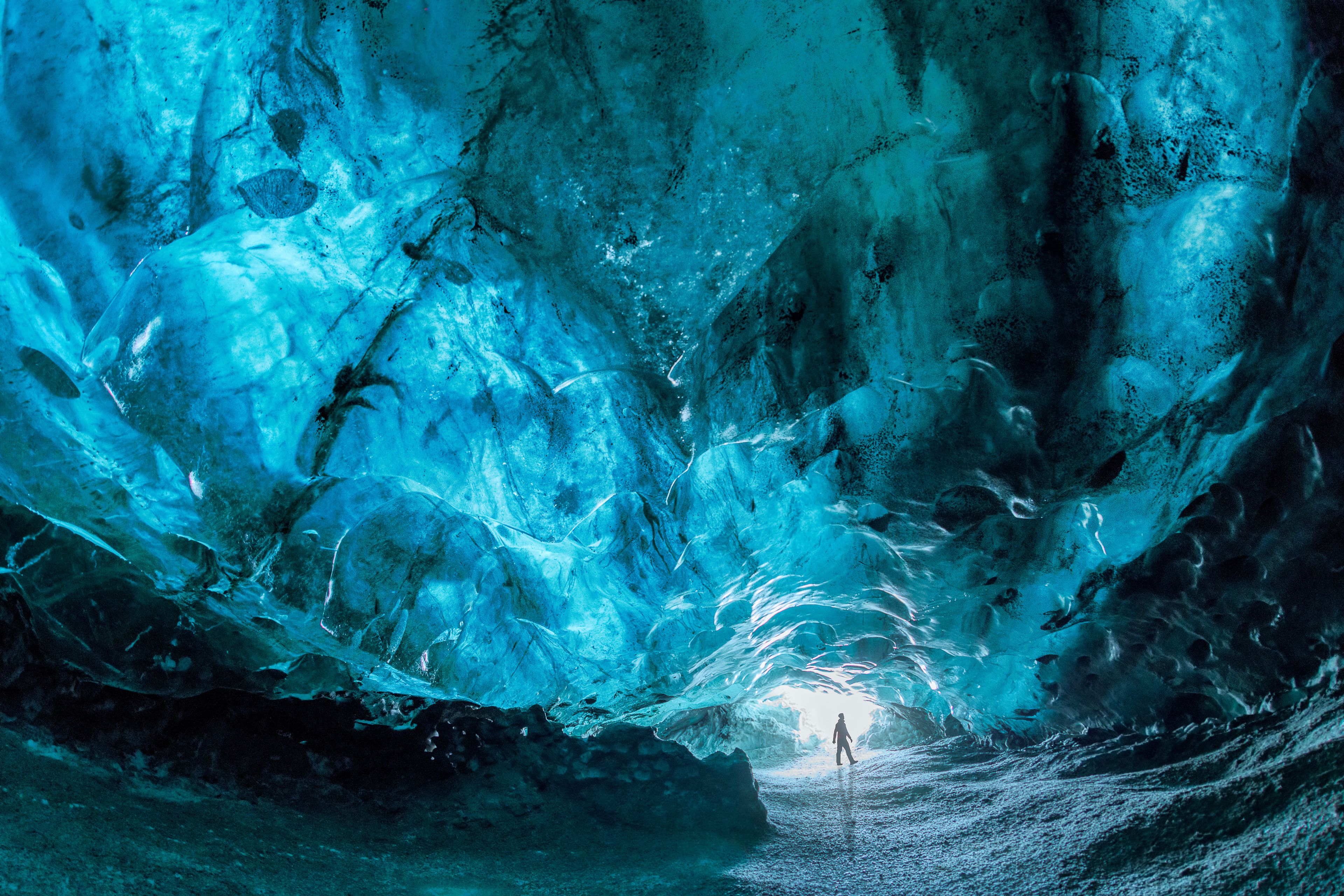 Ice in some caves looks bright blue because the ice is very dense. Snow piles up on glaciers and never fully melts, so the weight of new snow squashes out air bubbles in the older layers. This dense ice absorbs most colors of light but reflects blue. The thicker and denser the ice, the deeper the shade of blue. In some places, the ice looks almost like a sapphire, especially under direct sunlight or when illuminated by a flashlight. Newer, less dense ice usually looks white. In some Icelandic caves, black streaks in the ice come from volcanic ash—a result of nearby volcanic eruptions. These details make each ice cave unique.