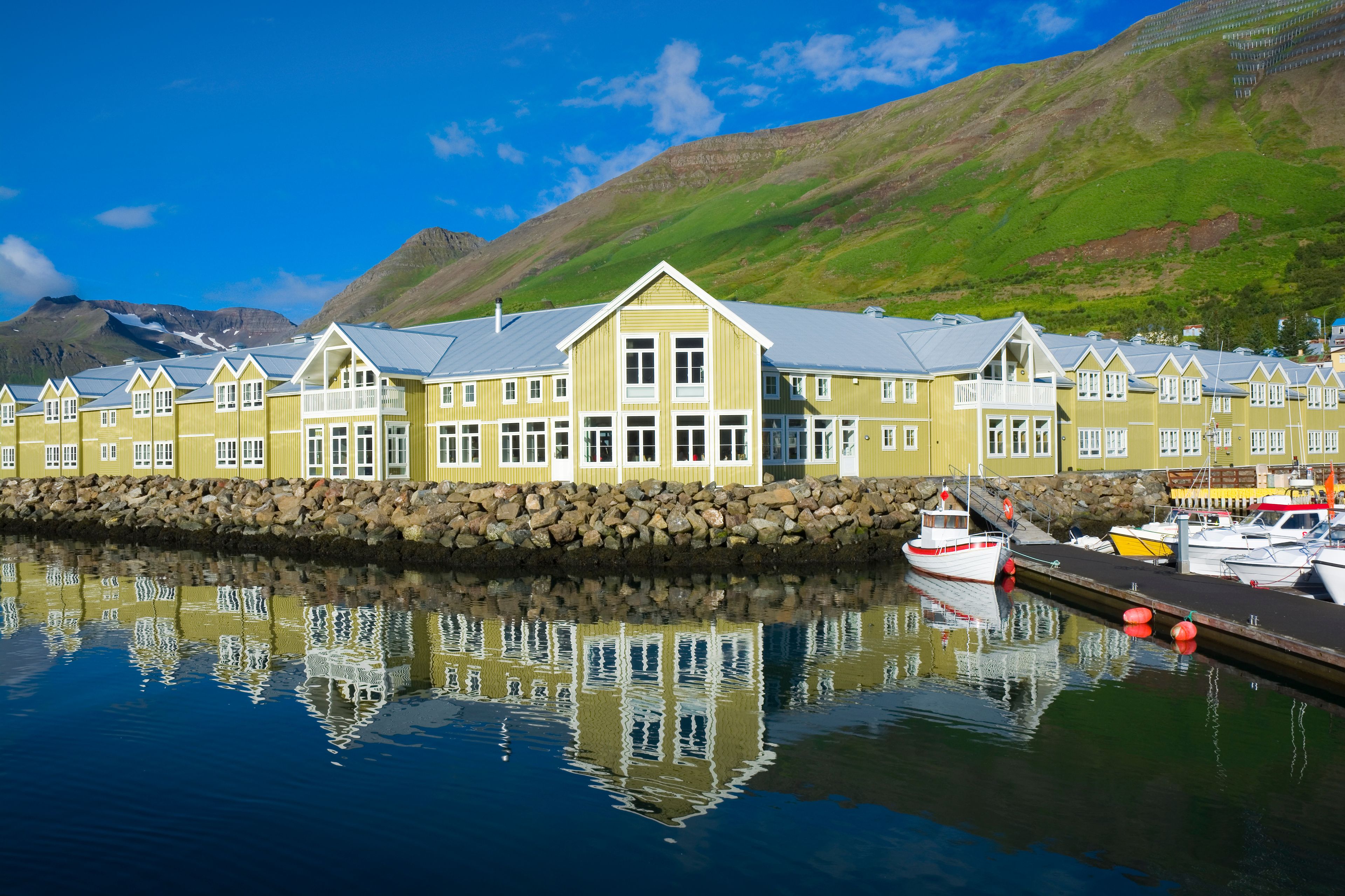 Es un hotelito de 4 estrellas justo en el puerto, con habitaciones que dan a la marina y las montañas. Tiene spa, jacuzzis, sauna y un restaurante con buena comida local. Las habitaciones arrancan en unos 28.000 ISK (195€) por noche en verano. Después de pasarte el día dando vueltas, se agradece volver a algo cómodo.